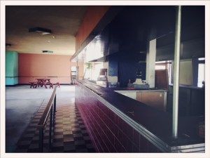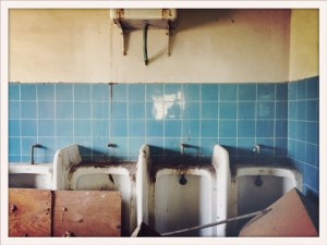 In the absence of answers, we explore further. The hotel’s gauche glory is a little tarnished now, leached to the bone by the acidity of time. The paint is in revolt, blistering from every surface; the floors slide beneath you yet are sticky to the touch; and the urinals are a still-life of rancid decay. Even the pigeons have scarpered.