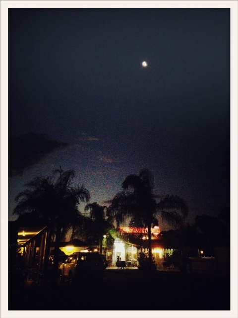 After a night of bellicose ribaldry, stories puddling on a sticky bar beneath exhausted elbows, we weave back to our sleeping hulk which is bathed in the glow of floodlights and well-placed palm trees, just another roadside attraction.
