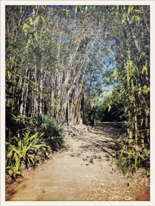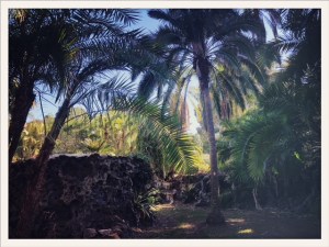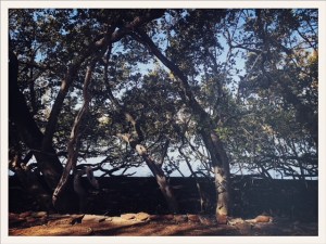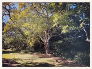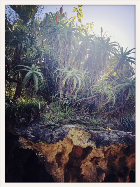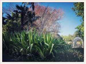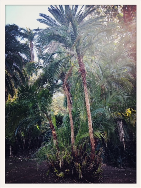 We investigate salt-fringed mangroves, swamp-oak floodplain forests and rare Turpentine stands. Desert fan palms, cycads, agave and aloe strut their oriental stuff around the grotto, while cedars, Kauri pines, Moreton Bay figs, orchids, Himalayan firs, hibiscus, oleanders, camellias, Indian hawthorn and more vie for attention, a riot of colour, scent and sound, their boughs heavy with the raucous chatter of maggies, parrots and cockatoos, fairy-wrens flitting like light on the leaves.