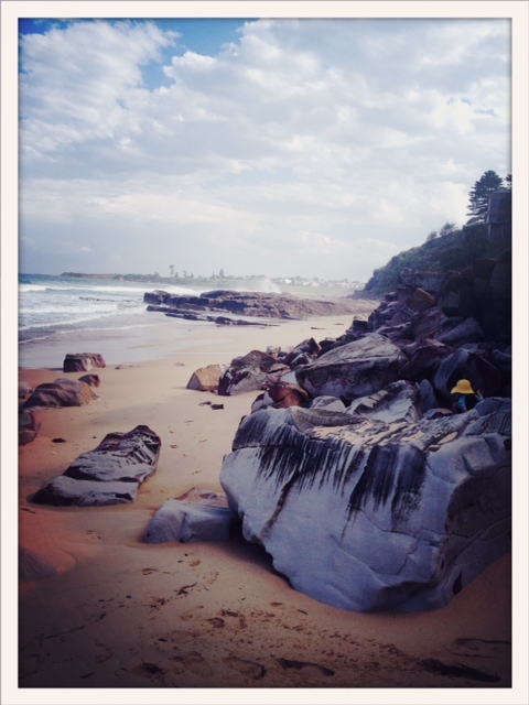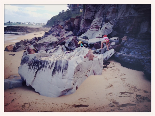 But it is the striated rocks, striped with ochre, that hold magic for the little people, an adventure waiting to happen. Bottle tops, nets, sand crabs and bailer twine, stones, sticks, shells and sand are soon treasure to be claimed and bartered, the highest rocky pinnacles a crows nest that gazes out to a stormy sea full of marauding pirates…