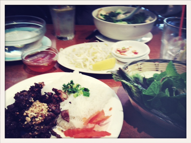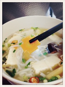 We over-order and lose sight of natural caution, ending up with ‘broken rice with shredded pork chop’, a side of flash-fried goat’s intestines and cubist carrots.