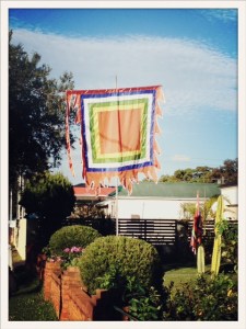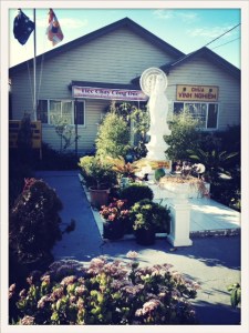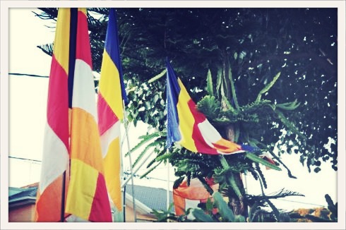 Around the next corner Buddhist flags entwined with the Southern Cross fly high, streams of colour adorning a huddle of temple-houses: